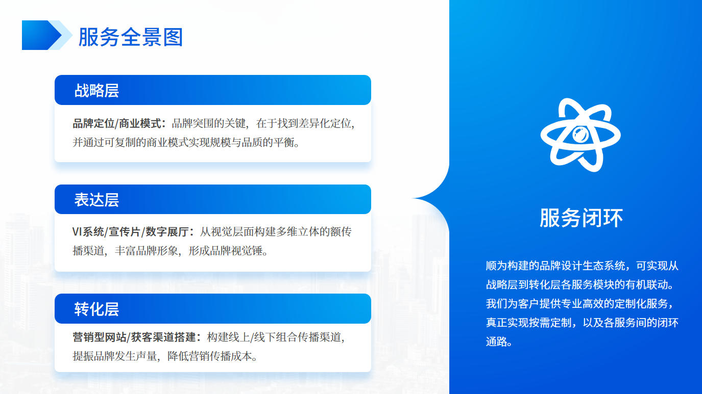 顺为构建的品牌设计生态系统,可实现从战略层到转化层各服务模块的有机联动。我们为客户提供专业高效的定制化服务,真正实现按需定制,以及各服务间的闭环通路。