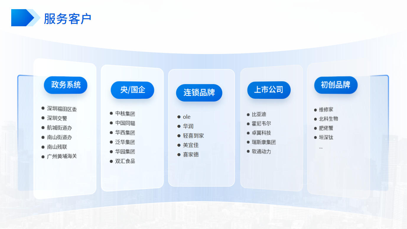 我们的客户群覆盖了包含:深圳福田区委、航城街道办、黄埔海关等政务机关单位,中核集团、中国同辐、华西集团、中建五局等央国企单位,ole、华润、比亚迪、中兴、有为集团等上市公司,轻喜到家、北科生物等知名初创品牌。