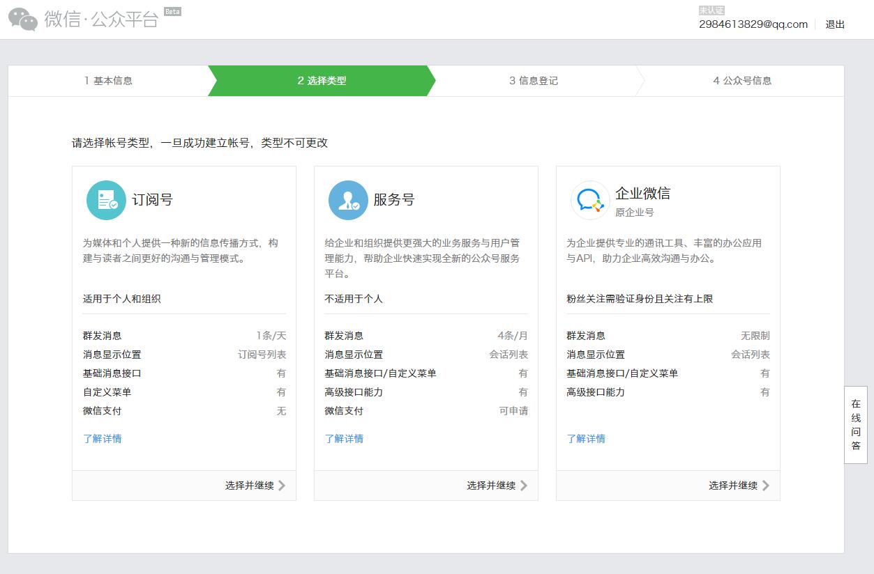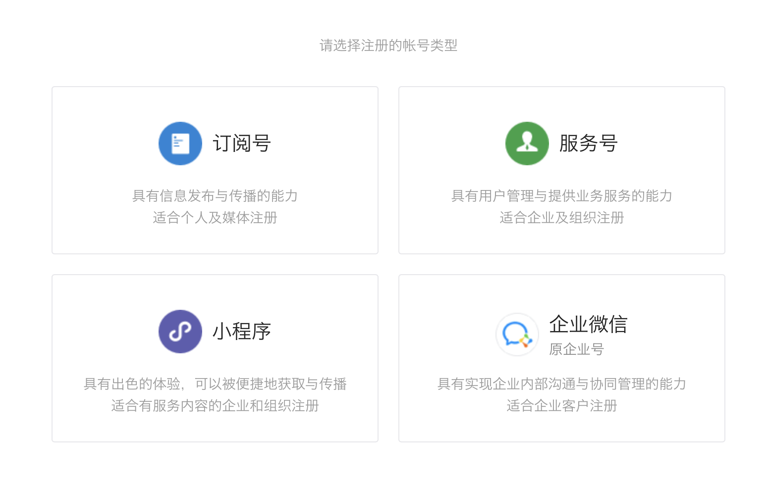 这里我们可以看到,公众号下面有四个选项:订阅号、服务号、小程序和企业微信。下面我们就来讲讲,这四个选项有什么区别。