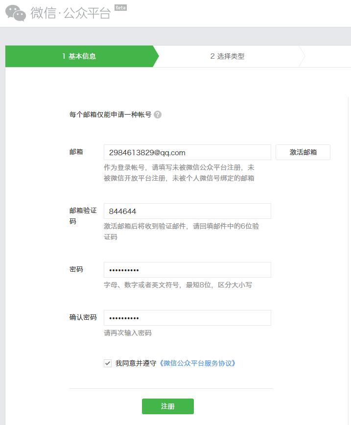 基本信息,这个选择一个没有注册过微信公众号的邮箱注册即可。