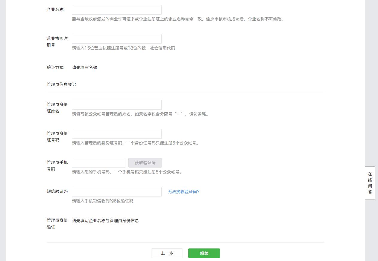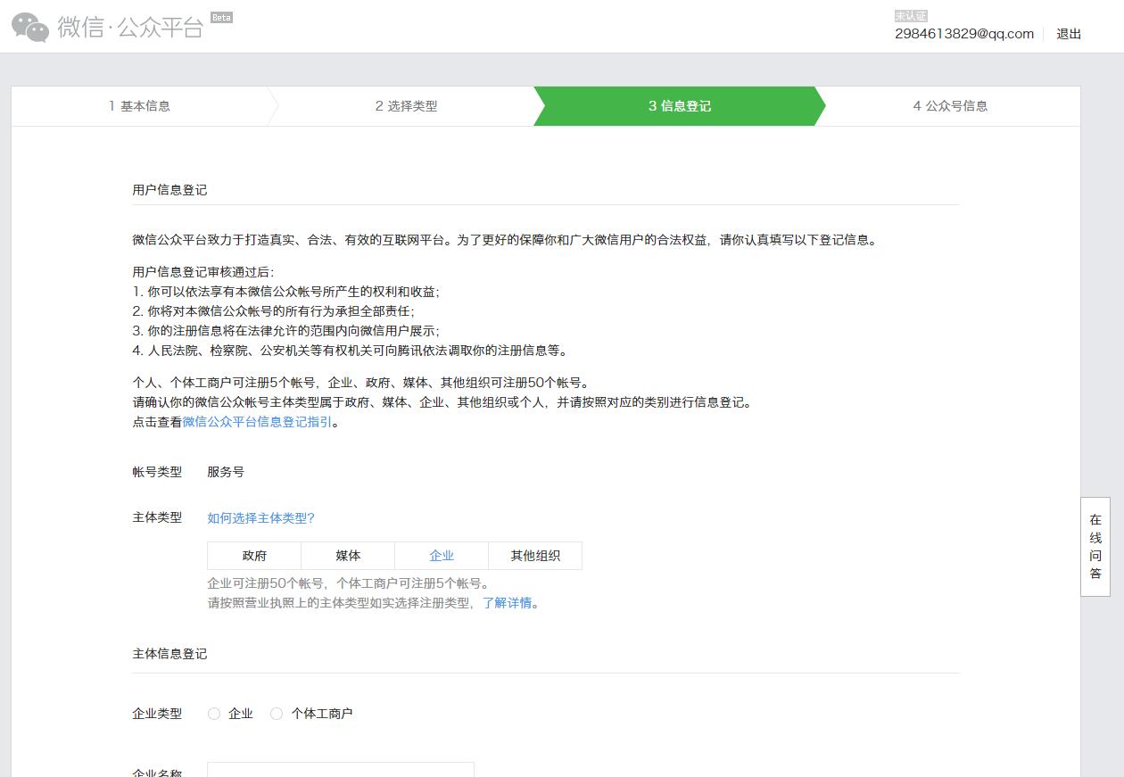 信息登记,这一步比较重要,我们可以看到,填完企业信息之后需要验证,有三种验证方式可供选择:支付验证、微信认证、法定代表人验证。