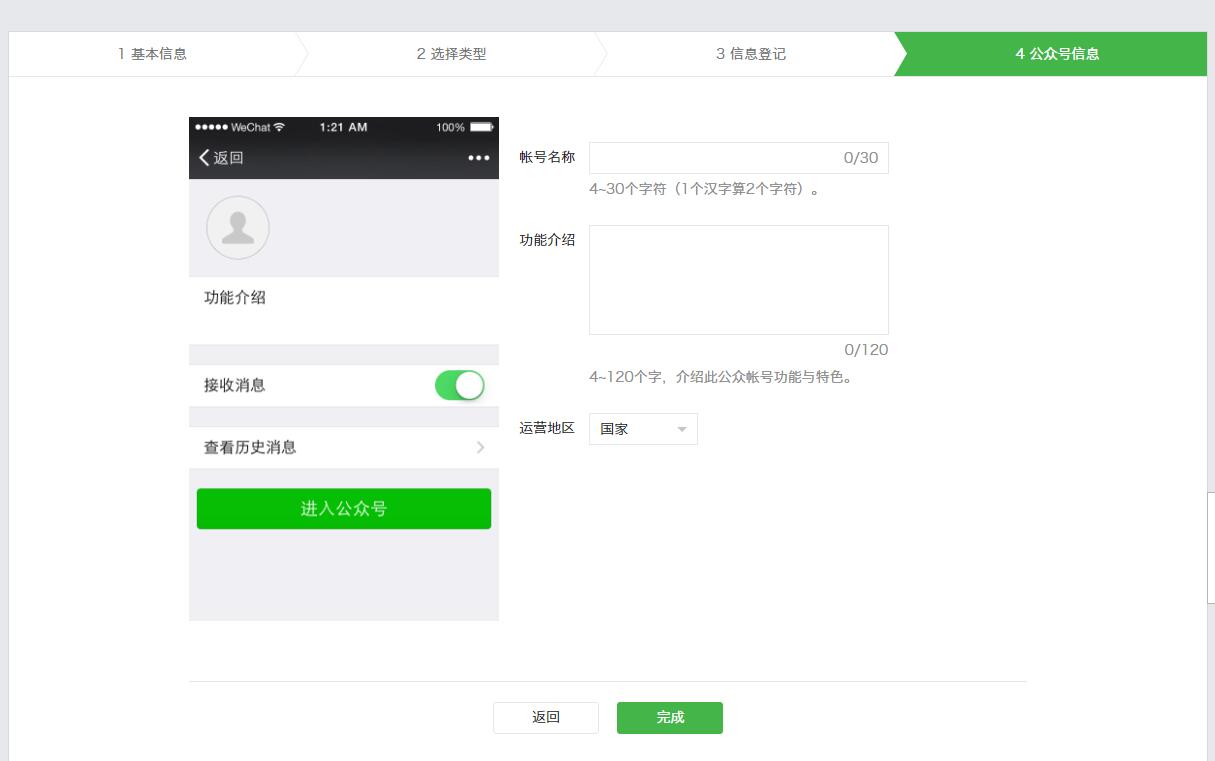 填完所有信息之后,就是最后一步--公众号信息填写了。这里可以上传头像,填写公众号介绍等等。这是公众号面对潜在粉丝的第一道关,公众号是否能吸引到更多人关注,这部分内容也有相当大的关系。做完这一步,我们的注册工作就告一段落了,接下来大家就尽情发挥自己的创意吧!